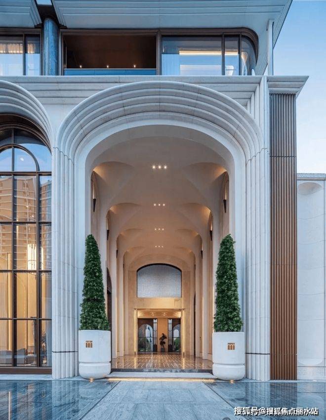石材基座配宝格丽绿奢石拱门,仿石铝板搭古铜线条,像给建筑装了“油画框”,高级感拉满。
