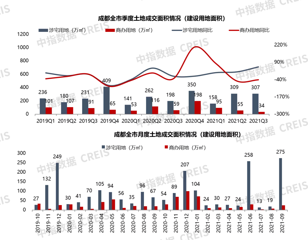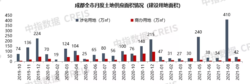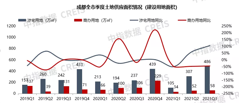 成都三季度涉宅用地供应面积486万㎡,同比上升105.3%,环比上升58.01%;商办用地供应面积约58万㎡,同比下降45.5%,环比上升11%。受“两集中”供地政策影响,8月供应量明显高于去年同期。