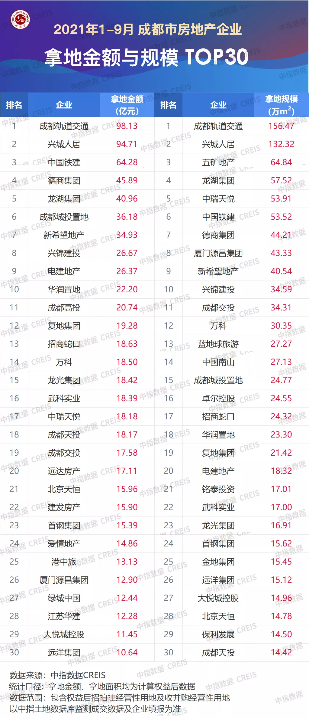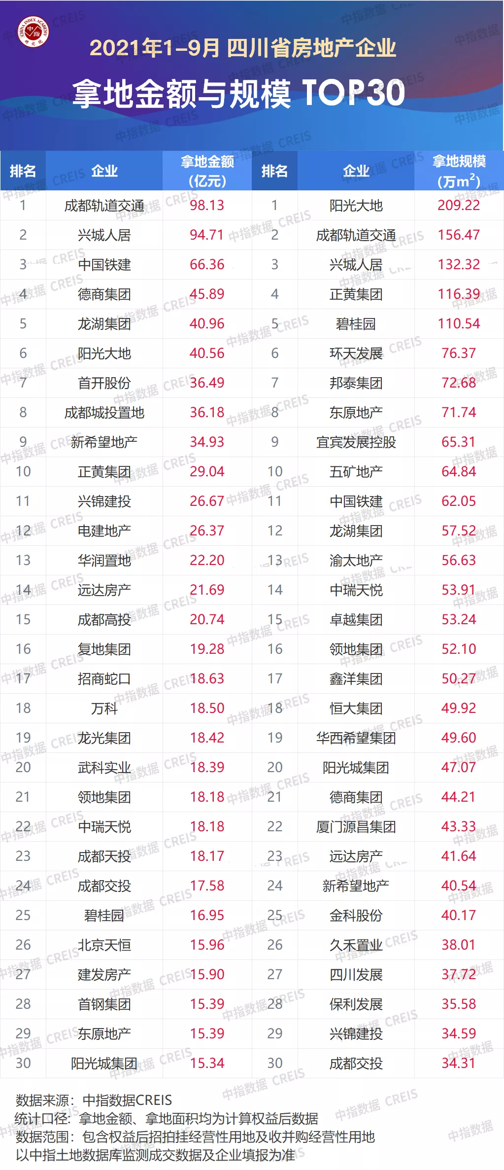 2021年1-9月,成都轨道交通以98.13亿元,实现在川拿地金额先进。阳光大地1-9月在川拿地规模为209.22万方,表现突出。