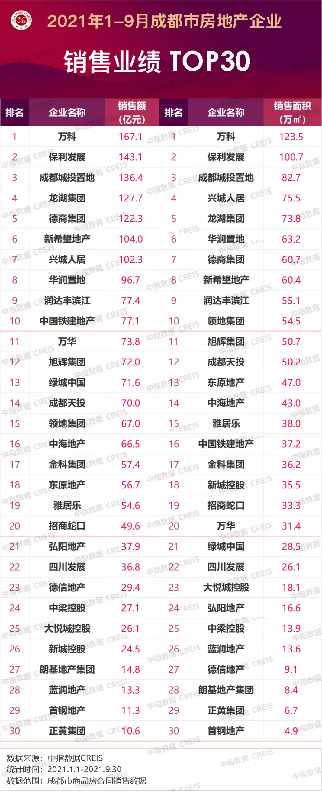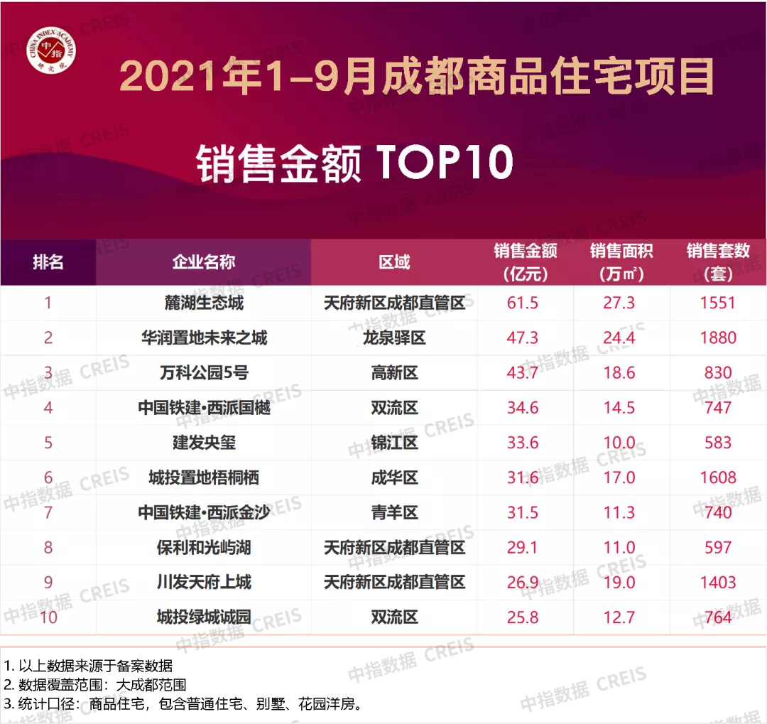 数据说明:房地产企业销售数据统计是以2021年1月1日-9月30日期间销售的商品房为统计口径,主要依据中指数据CREIS在成都的销售监测数据,并参考当期总体经营情况和推盘去化情况进行分析统计;对于少数没有在监测范围内的项目,由企业提供相关证明文件,经课题组对数据进行严格审核,也纳入统计范围。本报告仅供参考,课题组不对使用报告及其内容所引发的任何直接或间接损失承担责任。
