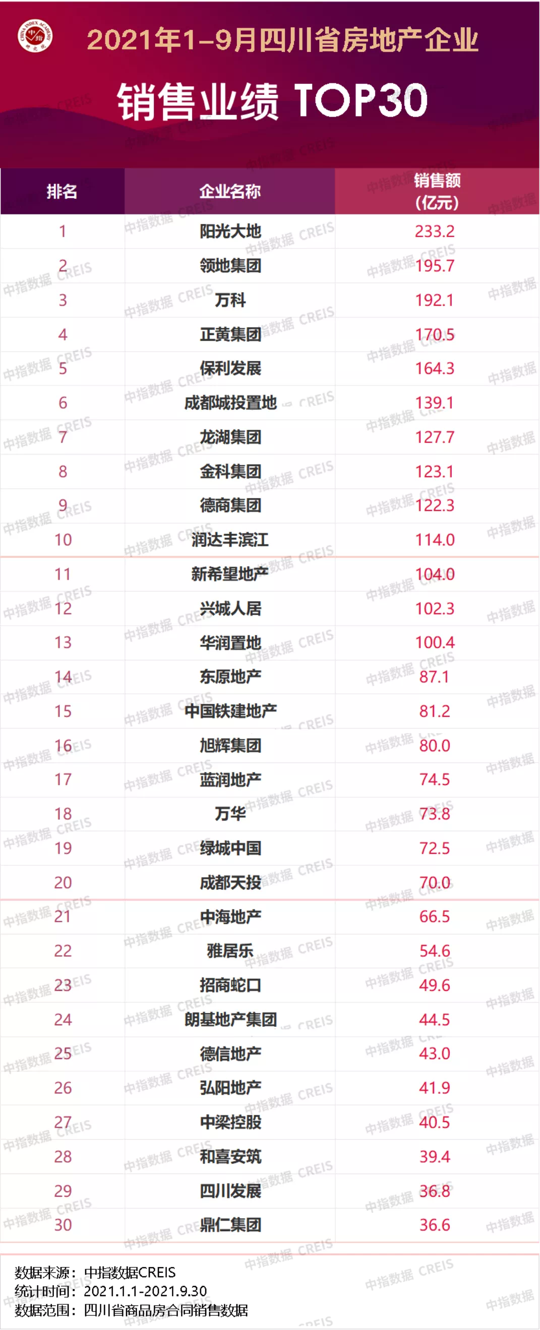 数据说明:房地产企业销售数据统计是以2021年1月1日-9月30日期间销售的商品房为统计口径,主要依据中指数据CREIS在四川的销售监测数据,并参考当期总体经营情况和推盘去化情况进行分析统计;对于少数没有在监测范围内的项目,由企业提供相关证明文件,经课题组对数据进行严格审核,也纳入统计范围。本报告仅供参考,课题组不对使用报告及其内容所引发的任何直接或间接损失承担责任。