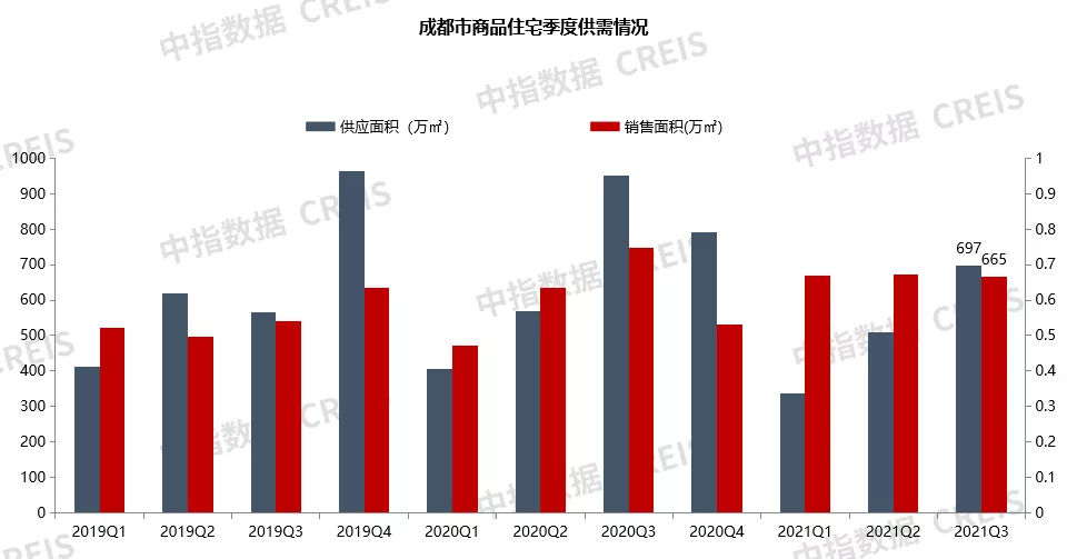 成都市商品住宅三季度成交面积665万㎡,同比下降11.2%,环比下降1%。供应面积为697万㎡,同比下降26.7%,环比上升36.9%。