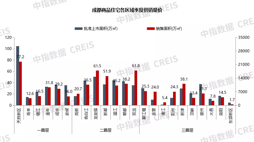 从供应成交面积来看,天府新区为三季度商品住宅主力供需区域,天府新区三季度供应面积104.7万㎡,成交面积77.2万㎡,均先进其他区域。
