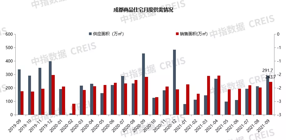 2021年9月成都全市商品住宅供应面积291.7万㎡,环比上升37.5%,同比下降36.0%;成交面积243.7万㎡,环比上升20.7%,同比下降13.7%。三季度连续三个月供应量回升,并未对市场形成有效刺激,随着房住不炒的持续深化,以及新政策的不断出台,购房者更加理性,市场成交保持平稳。