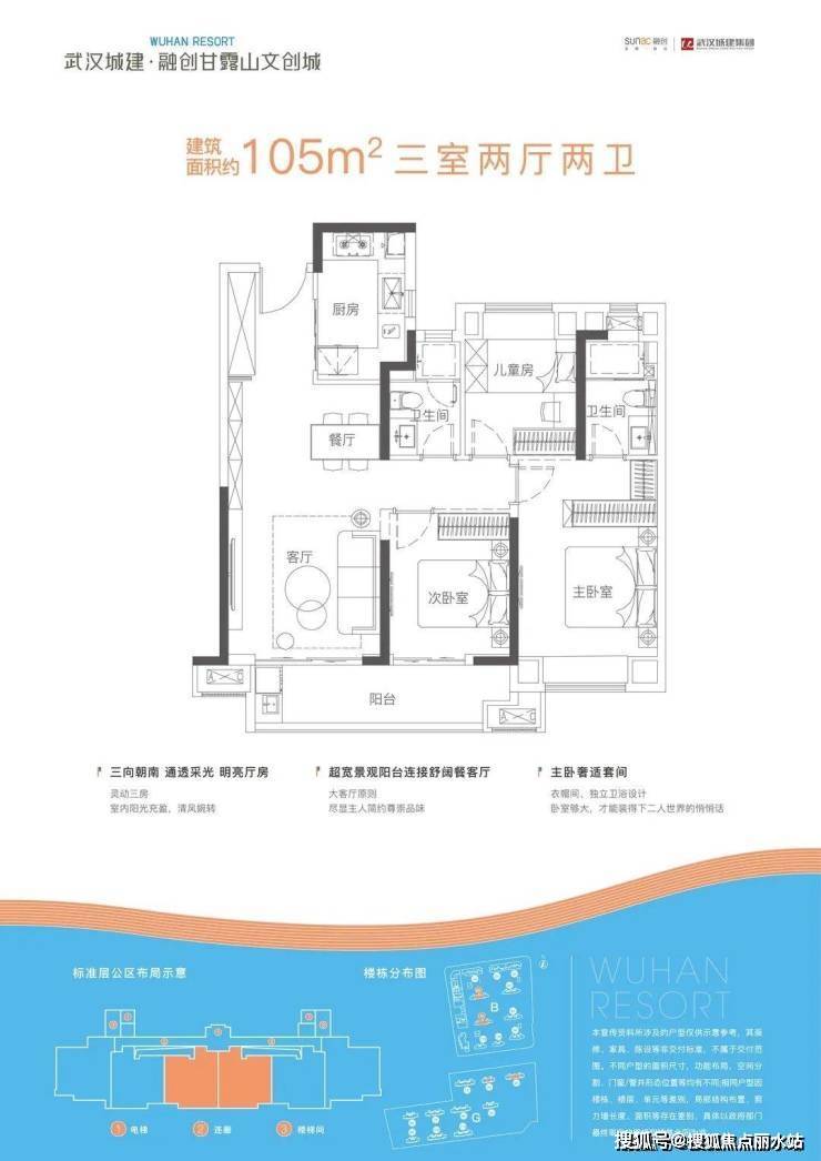 武汉城建·融创甘露山文创城匠筑建面约105㎡三室两厅两卫户型,为全年龄周期家庭构筑温润有光的生活场域。
