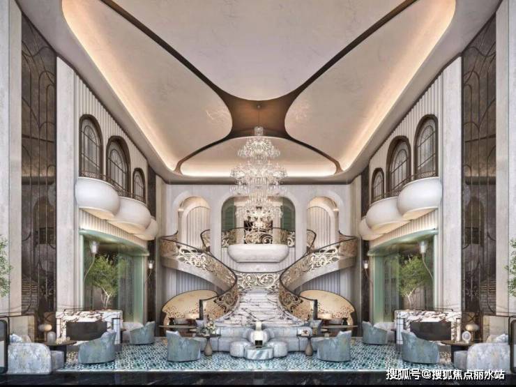 会所参照厦门千万级豪宅宸启瑞湖的海派奢装,花瓣式艺术吊灯、南洋釉彩地砖、Art Deco珐琅彩玻璃……