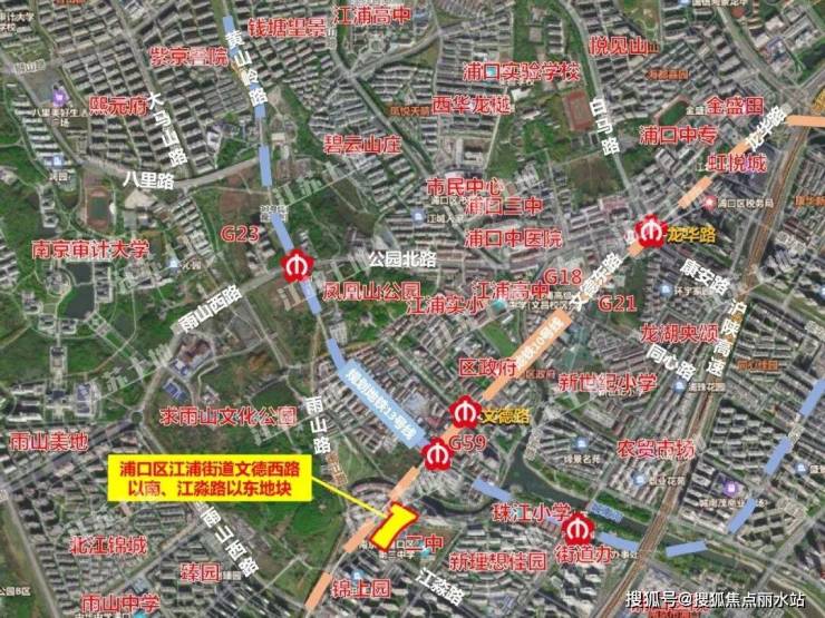 项目位于浦口区江浦街道,东至规划双桥路,西至江淼路,南至规划凤凰台路,北至文德西路及现状临街商住,地块北侧为现状轨道交通10号线文德路地铁站,地块南侧为现状浦口区第二中学,同时,该地块临近求雨山公园,地理位置十分优越,周边有龙湖亚伦央璟颂、中海万锦熙岸、三金鑫宁府、南京悦江府等住宅项目。