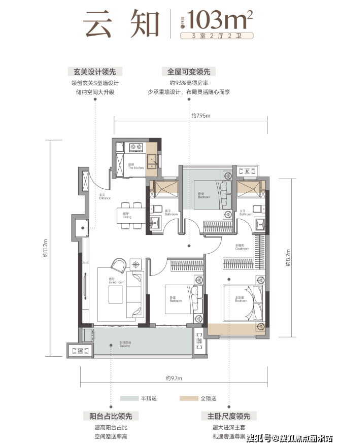 建面约103平 三房两厅两卫:连廊中间户,三开间朝南,北边对连廊,优化空间较多,南向大阳台,是常规中间户的格局。