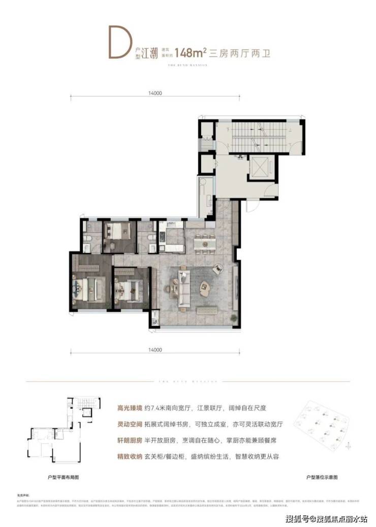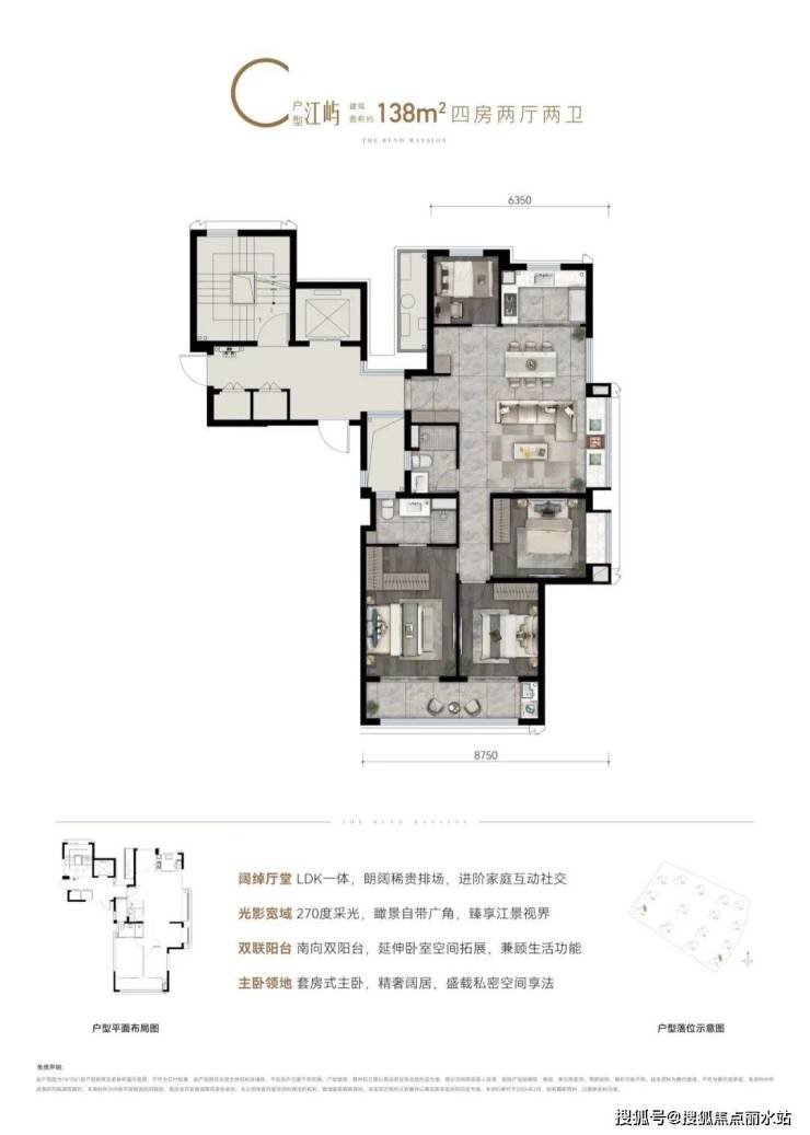 以江水波纹为设计灵感,精筑玻璃天幕立面,公建化立面,全封闭阳台,缀以优雅金属线条,顶部标志性塔冠造型,层层退台,为城市天际塑立时代地标,点睛江岸封面。