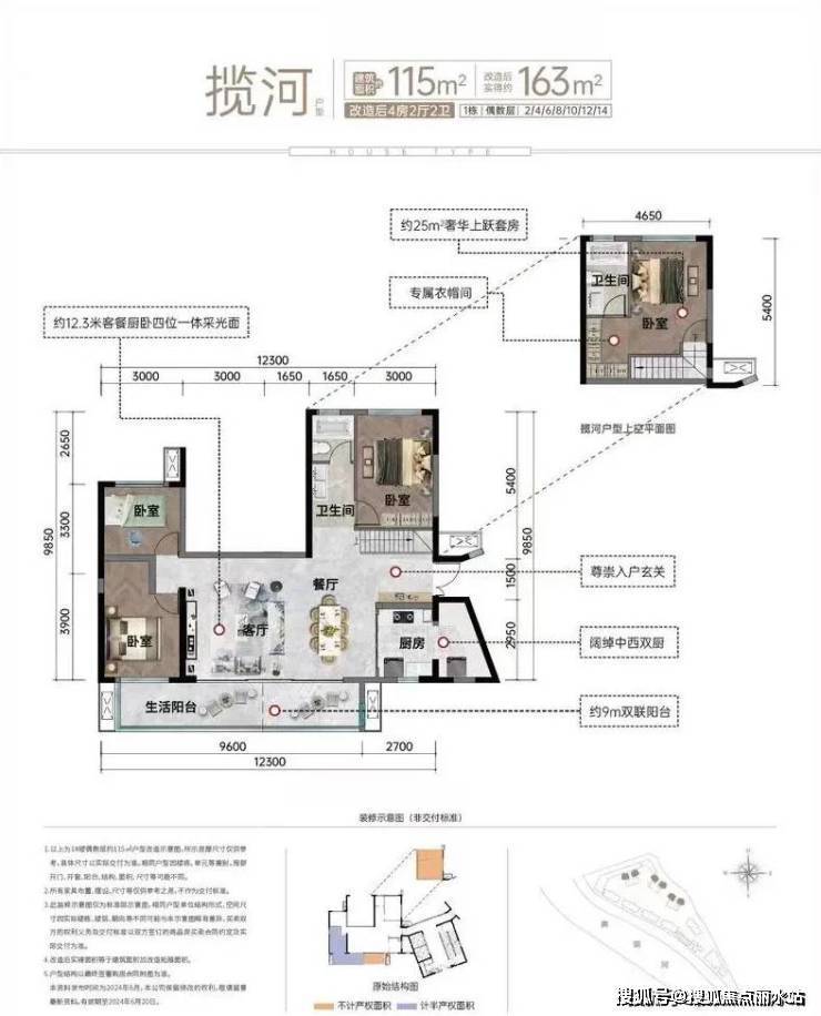 建面115平户型,赠送空间约48平,改造后实得面积约163平。