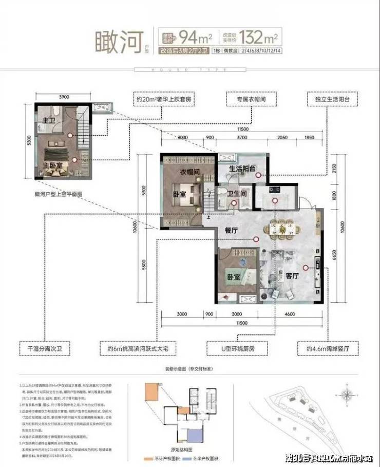 建面94平户型,赠送空间约32平,改造后实得面积约132平。