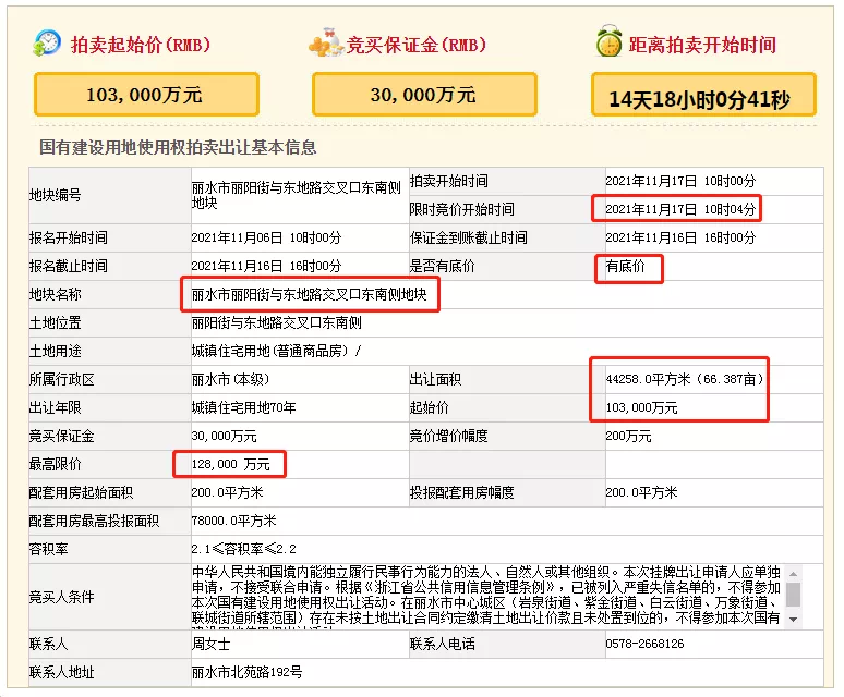 丽水市丽阳街与东地路交叉口东南侧地块起始价103000万元,出让面积44258m²(66.387亩),起始楼面价13072元/m²。预计将于11月17日出让。