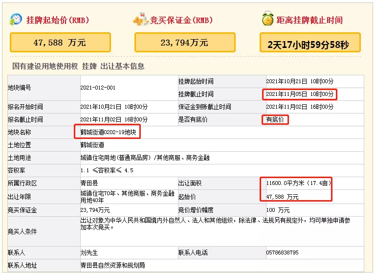青田县鹤城街道0202-19地块起始价47588万元,出让面积11600m²(17.4亩),起始楼面价9116元/m²。本次挂牌出让设置底价,预计将于11月5日出让。