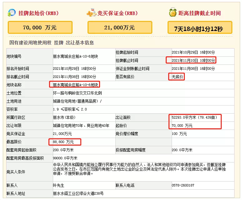 丽水南城余庄前A-10-6地块起始价70000万元,出让面积52293m²(78.439亩),起始楼面价6693元/m²。预计将于11月10日出让。