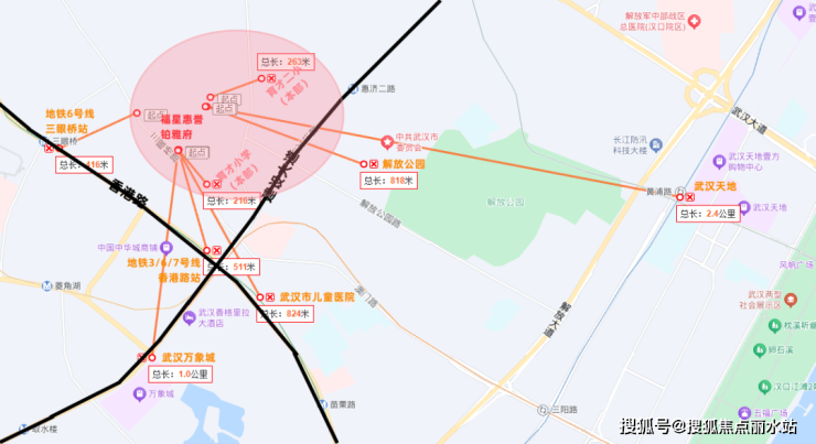 建设大道沿线又有若干高光区,三地铁交汇的香港路,识别度不可谓不高。放眼武汉,三地铁交汇(已建成线路)的地段极少。地铁3、6、7号线交汇于香港路,周边众多城市级资源、重量级机关和企事业单位汇聚于此,交通枢纽价值叠加区位优势价值,汉口核心无出其右。
