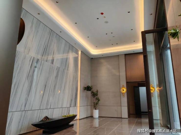高奢酒店式归家入口,与道路之间预留了非常开阔的广场空间,业主回家看到的第一眼面子感十足,长约20米的瑰丽奢石景墙阵列迎宾,艺术雕塑与灵感喷泉相得益彰,将归家仪式感做得很足,完美拉开了与一般改善楼盘的差距。