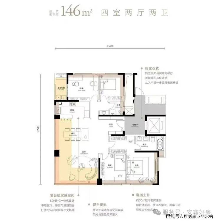 项目容积率仅2.5,为准四代产品,外立面采用大面宽玻璃幕墙与质感铝板,户户独梯入户;并配置了目前室内罕见的阳台外花池,270度天幕观景,得房率高达106%。