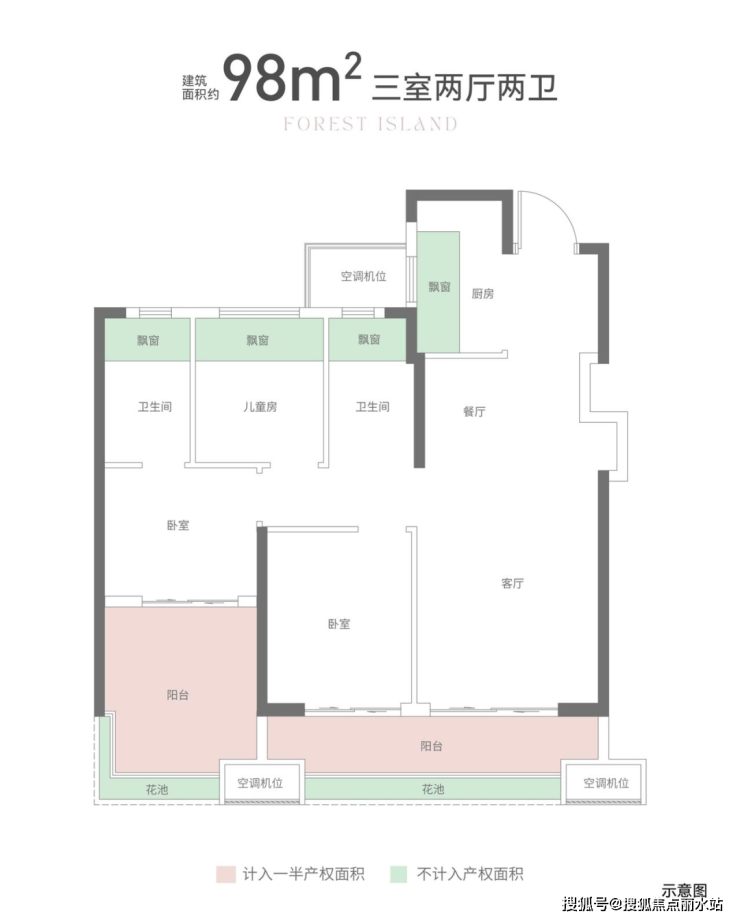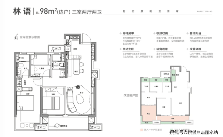 98㎡高层三房两厅两卫,南向三面宽,双联阳台,主卧独立衣帽间,主卧小家化设计,创新S墙收纳;