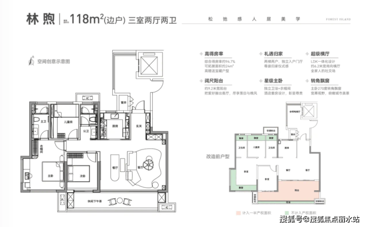 118㎡小高层三房两厅两卫设计,南向3.5面宽,2梯2户,独梯入户,约6.2米大面宽超级横厅,约9米宽双联阳台,主卧独立衣帽间,边户设置270度转角飘窗。