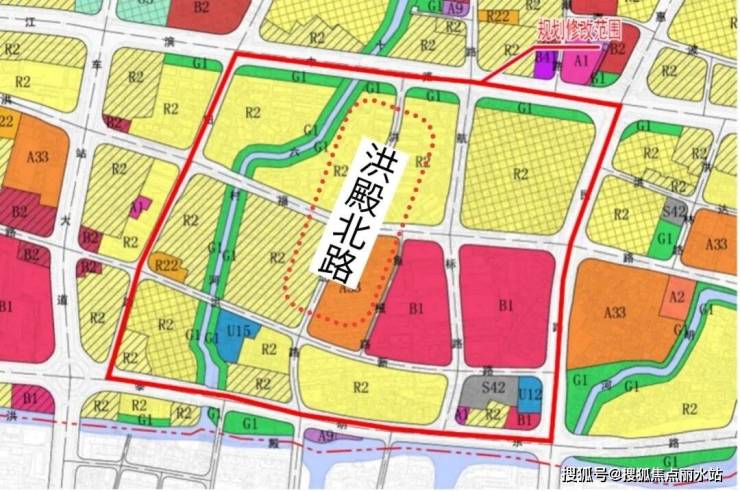 洪殿北路老走向与地块道路新走向示意图。来源:市城市规划设计研究院