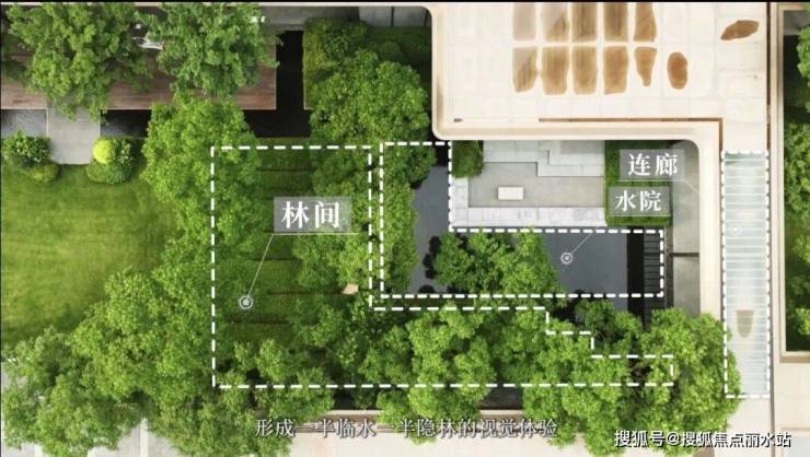 社区前厅作为“第一印象”,既要体现仪式感,又要营造自然与艺术的融合。我们以"水院连廊映乌桕,法棍种植隐林间"为植物设计理念,采用“水院+连廊+林间”的三段式布局,形成“一半临水,一半隐林”的视觉体验。