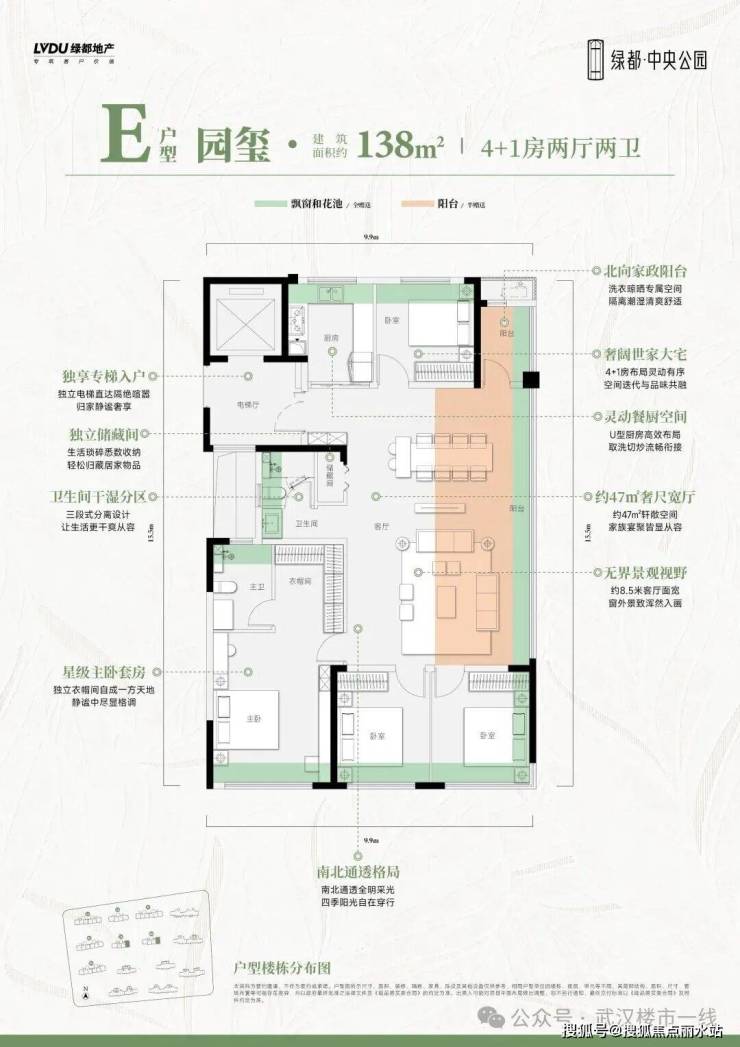 建面约138平四房,作为端头边户,房源数量较少。没有走道,空间利用率达到极致。东向大宽厅设计,非常奢侈。可变4+1房,更灵活满足家庭所需。