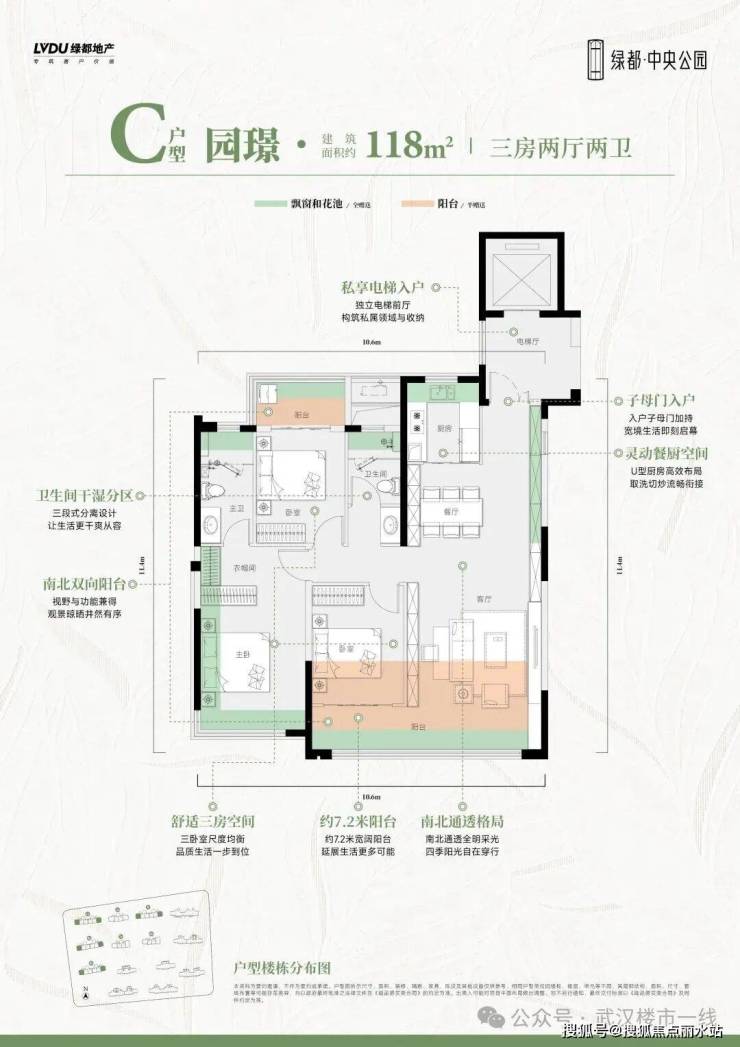 建面约118平三房,则是东、西端头边户,户型整体通透感大幅提升。该户型有可享专梯入户和私家电梯厅,优越感大大提升。同样是双阳台,北向阳台尺度更大。厨房可以实现北向直接采光。厨房与餐厅的组合、大通厅的尺度感明显更好。套房主卧,带有270度的转角大窗,优越感大大升级了。