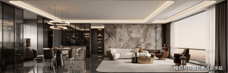 公区的打造,在肉眼可见的地方,孤珍集萃,层层精饰,天誉东方选用了从玛瑙背景岩板、木纹铝板、透光云石等多种奢材打造奢享入户大堂。通过手工打磨、专属定制的方式,让公共空间舒适的就像为自己私人定制。