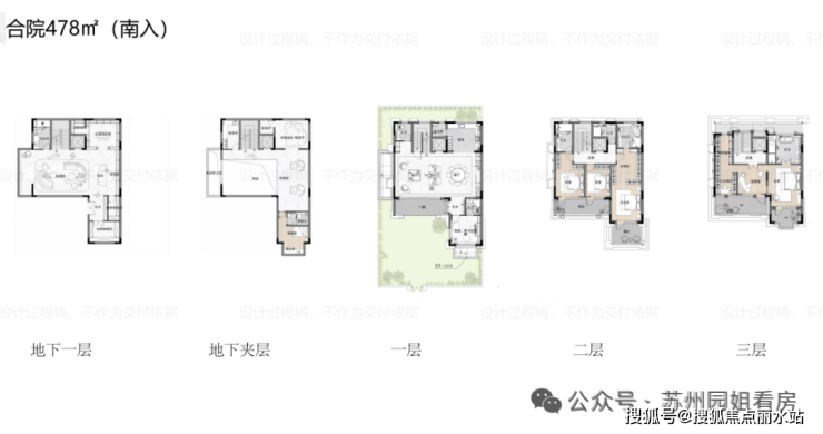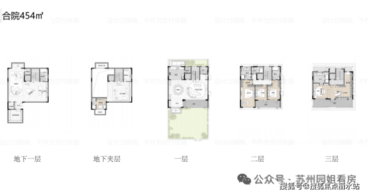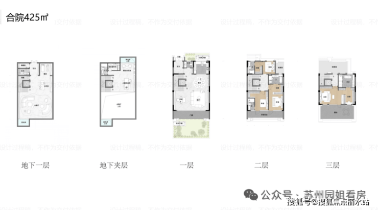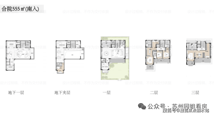联排建面约425-711㎡,首层层高3.7米,二层3.3米,三层3.2米。