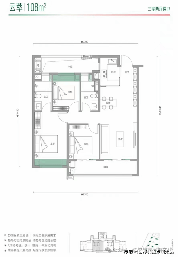 根据户型分布平面图来看,该户型所在楼栋为3梯4户格局,双连廊设计,该户型位于楼栋边户,南北通透,三开间朝南,南向有连接次卧和客厅的大阳台;户型比较方正且动静分区较好,但是过道有点浪费面积,另外根据户型图显示,该户型可以做到一梯一户的居住体验。
