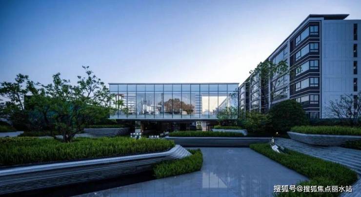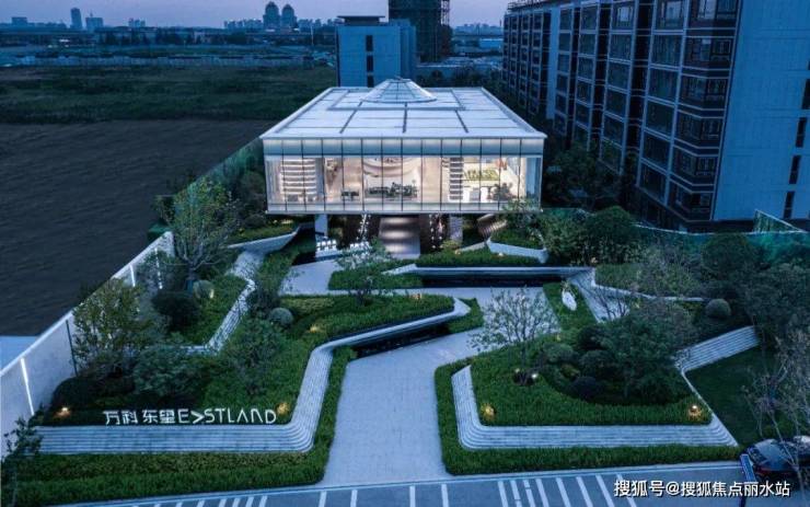 走入前场,高低转折的树池与跌水隐喻山谷瀑布,层层叠叠的树池,玻璃盒子漂浮在青葱树荫之上,通透的质感和艺术美学的几何感颇具未来气质。