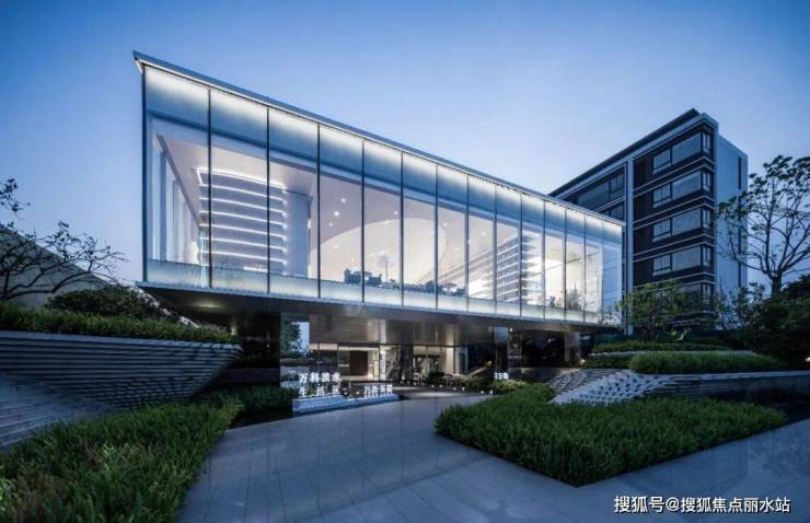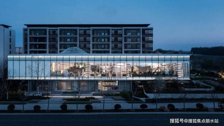 售楼处主体由上下两个通透的盒子组成,打造现代感极强的“漂浮的盒子”。立面采用大面积的超白玻璃,沿河景观视线通透,夜晚也是河边一个引人注目的“发光盒子”,成为该区域的地标。