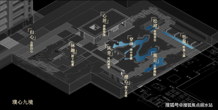 穿过社区大堂,步入内庭空间,通过基地现现存高差结合竖向设计,打造半山半林的生活道场。草木扶疏、溪水清冽、青石铺地,皆在叙说着隐奢、质朴之美。通过“璞心九境”展开空间叙述。