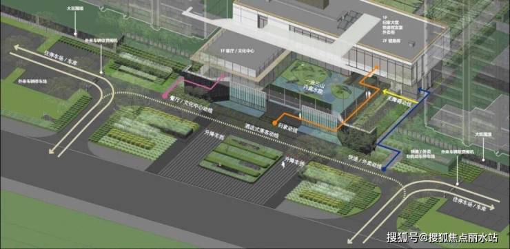 品质感的体现从酒店式落客庭院开始,无风雨落客让客户从下车到达大堂被风雨连廊庇护的,经过大区可通过升降梯从地下一层抵达每栋楼宇。确保无风雨归家。