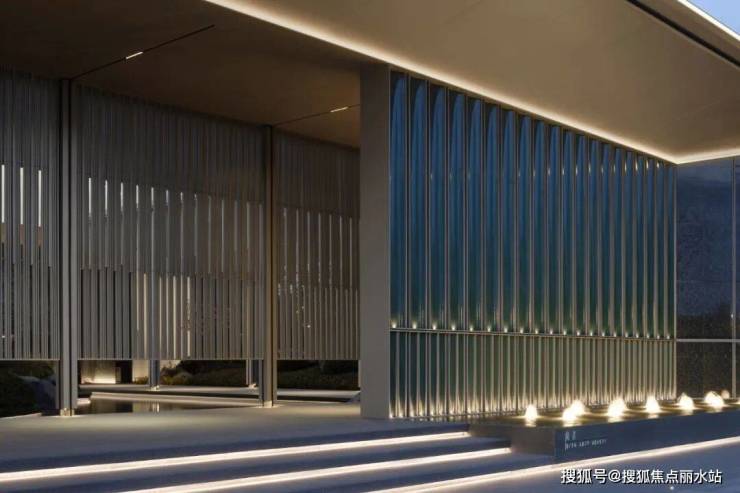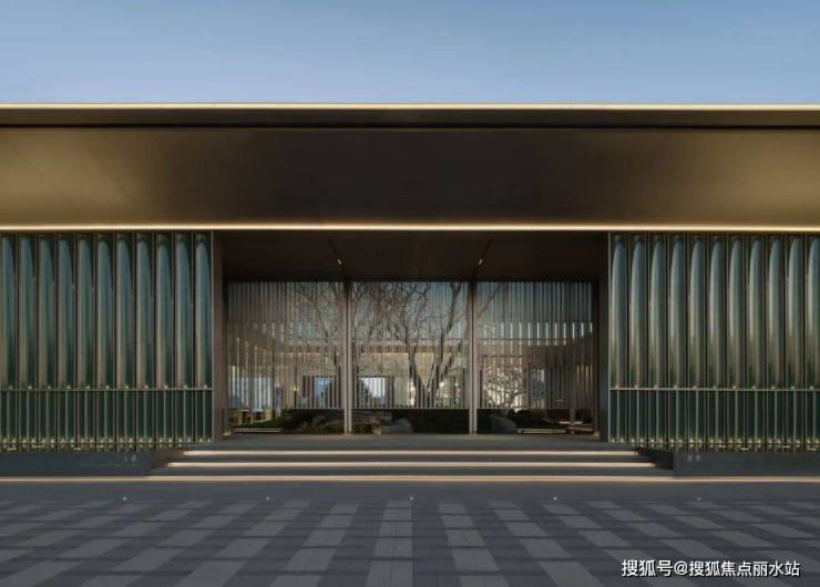体验感来自业主归家的行走长卷,44米超长面宽的门楼拉开横向展开序列,立面从两侧实墙过渡到半通透的陶板,再到中间朦胧感框景的层次递进。
