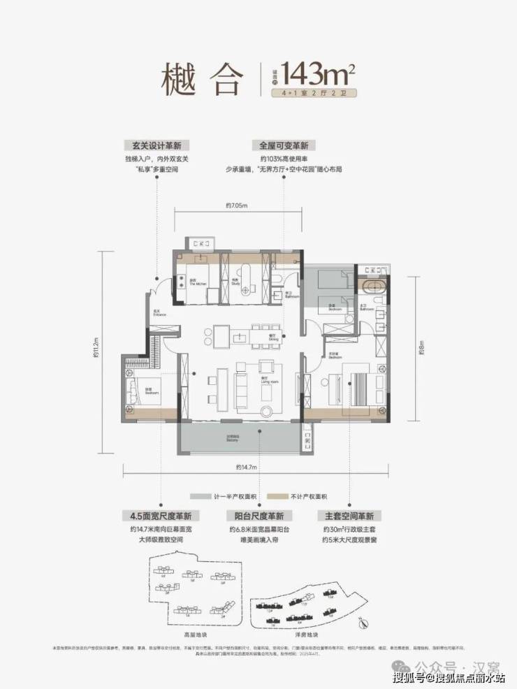 洋房面积142㎡,得房率达到103%,客厅连接阳台,阳台一半面积赠送,卧室利用好飘窗,空间感直接拉满。采用S墙设计,空间布局更合理
