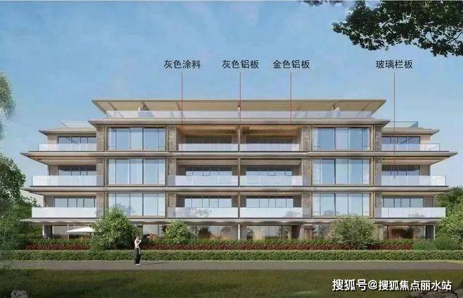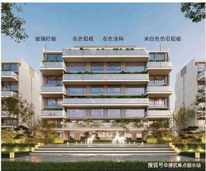 洋房外立面则是灰色涂料、灰色铝板、米白色仿石铝板和玻璃栏杆!