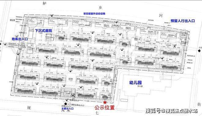 平面图上来看,小区内部西侧设计了一个下沉式庭院,旁边就是物业用房和地块出入口,这里大概也会是未来的售楼处。主出入口在小区南面,北面预留了一个人行出入口。