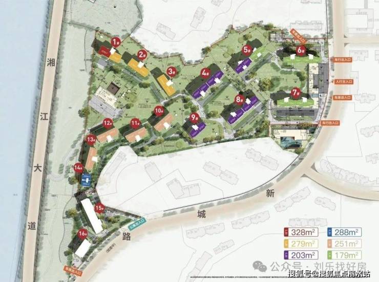 台地式布局:项目背靠原生山体,规划14栋住宅,台地式布局。整盘内凹设计,东高西低,错落有致,项目地块比湘江中路抬高约15米,可看江又无噪音烦忧。