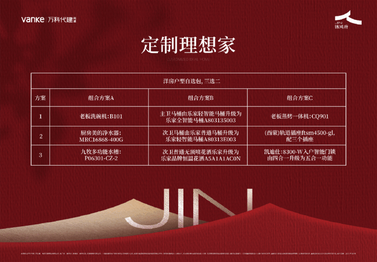 除中央空调、地暖、新风三大件的标准交付配置外,锦鸿府还推出“定制理想家”选装包(除基础装修交付,105㎡为毛坯外),客户可在预售阶段选择个性化装修方案,并由万科在交付时统一完成。