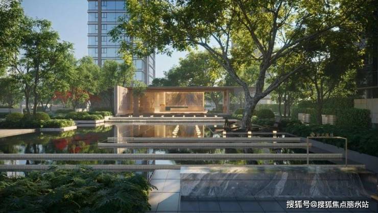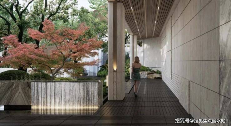 地势高差,也创造了引水入园的可操作性,水景错落有致,营造“九幕臻境”的仪式感,公区的隐奢质感,深入浅出。