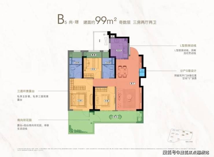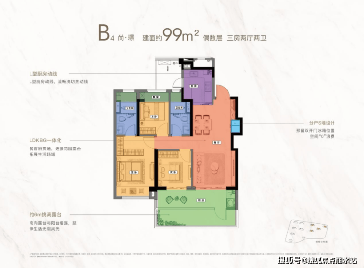 其次,起步户型建面约99㎡三房,低总价+户户带露台。