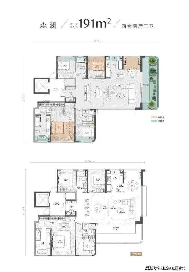 191㎡户型有着超20米的南向大开间,给片区带来前所未有的惊喜,采光率更高,生活起居面面向阳。庭院面积高达约22㎡。