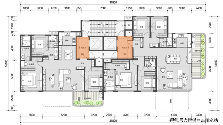 下沉水院会所,自然采光,配有恒温泳池、私宴厅等高端配套,让生活更精致。此外,单元楼栋的双入户大堂,自然采光井将阳光空气引入其中,地下大堂采用璀璨光厅设计。