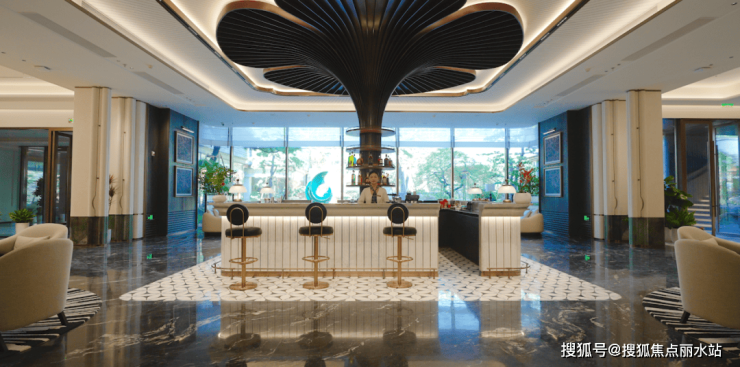 67米门厅,左右景墙搭配两棵百万迎客松,“浮光跃金”展现流水光泽,普拉达绿奢石石柱屹立两旁,让气场于无声中流露。