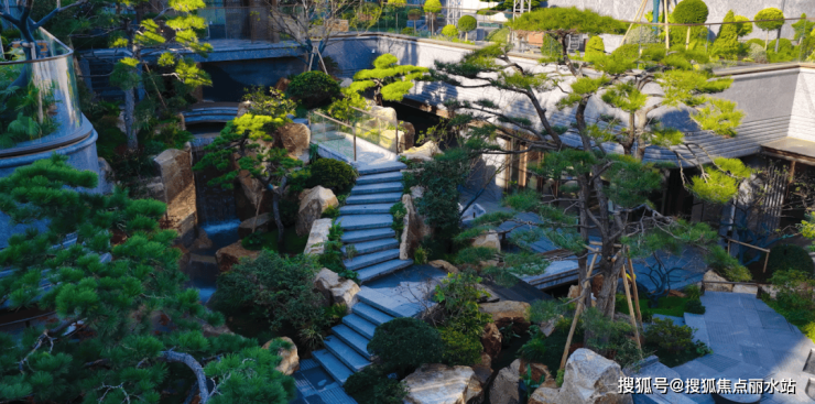 8 棵黑松没有刻意造型却很有章法,进口羽毛枫的叶脉在阳光下熠熠生辉。