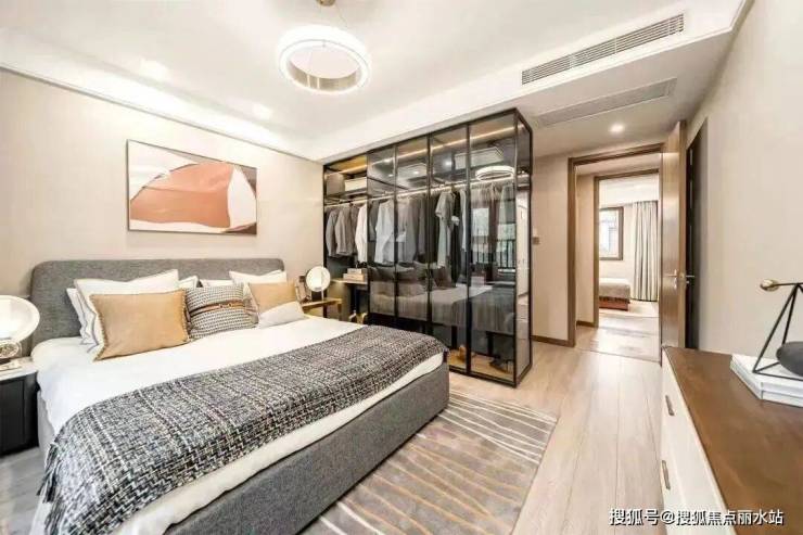 主卧套房设计,不仅为女主人划出了独立的衣帽+化妆间,还做了大量的收纳,卫生间是干湿分离空间,更具有私密性。