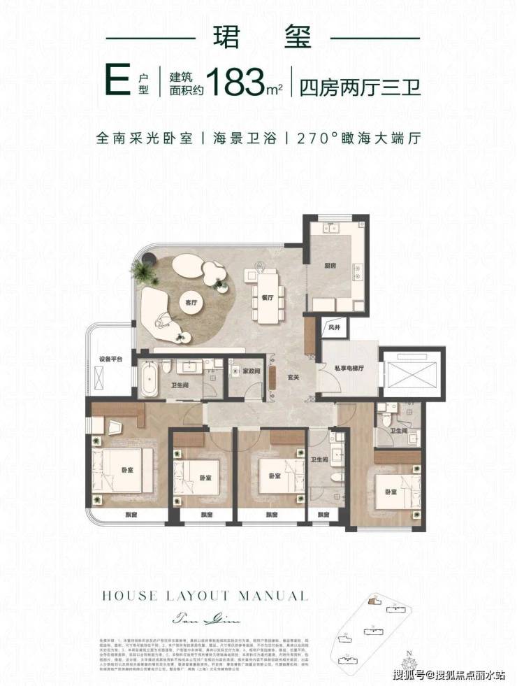 183㎡瞰海C位户型仅26席,四南卧布局采光无敌,北侧客厅与厨房直面海景,270°巨幕全景舱设计将一线海岸盛景尽收眼底。