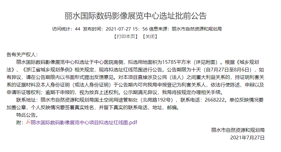 昨天,丽水市自然资源和规划局发布《丽水国际数码影像展览中心选址批前公告》。