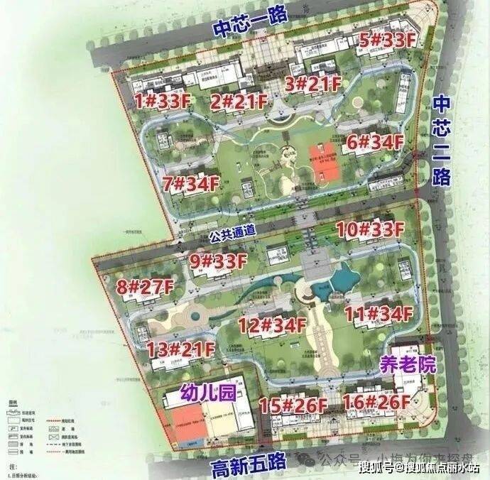 项目分两期开发,包含一期、二期,共规划有14栋高层住宅,一期二期之间规划有公共通道。